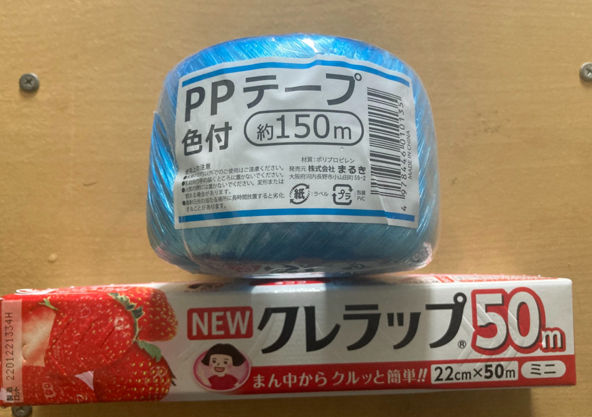 ラップに3本ほどPPテープを添えて適当に巻き、