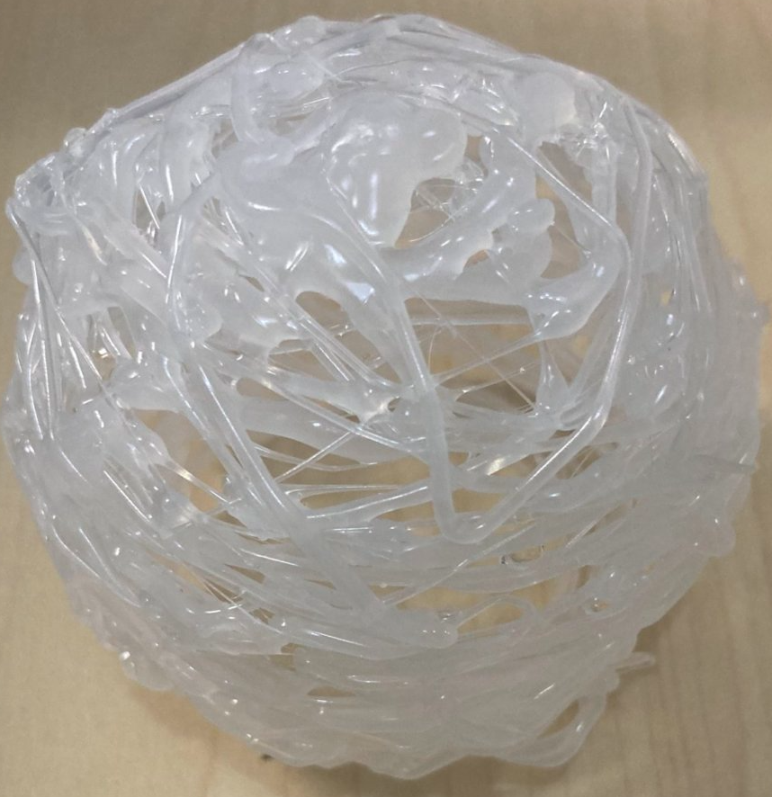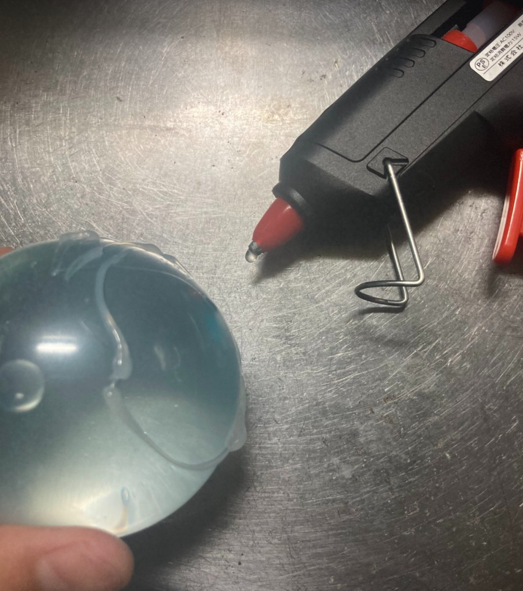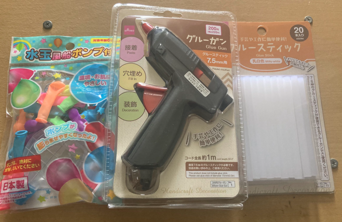 作り方はいつか見たお菓子作りテクニックと同じです。水風船に水を入れ、側面にグルーガンで糊を張り付けていきます。